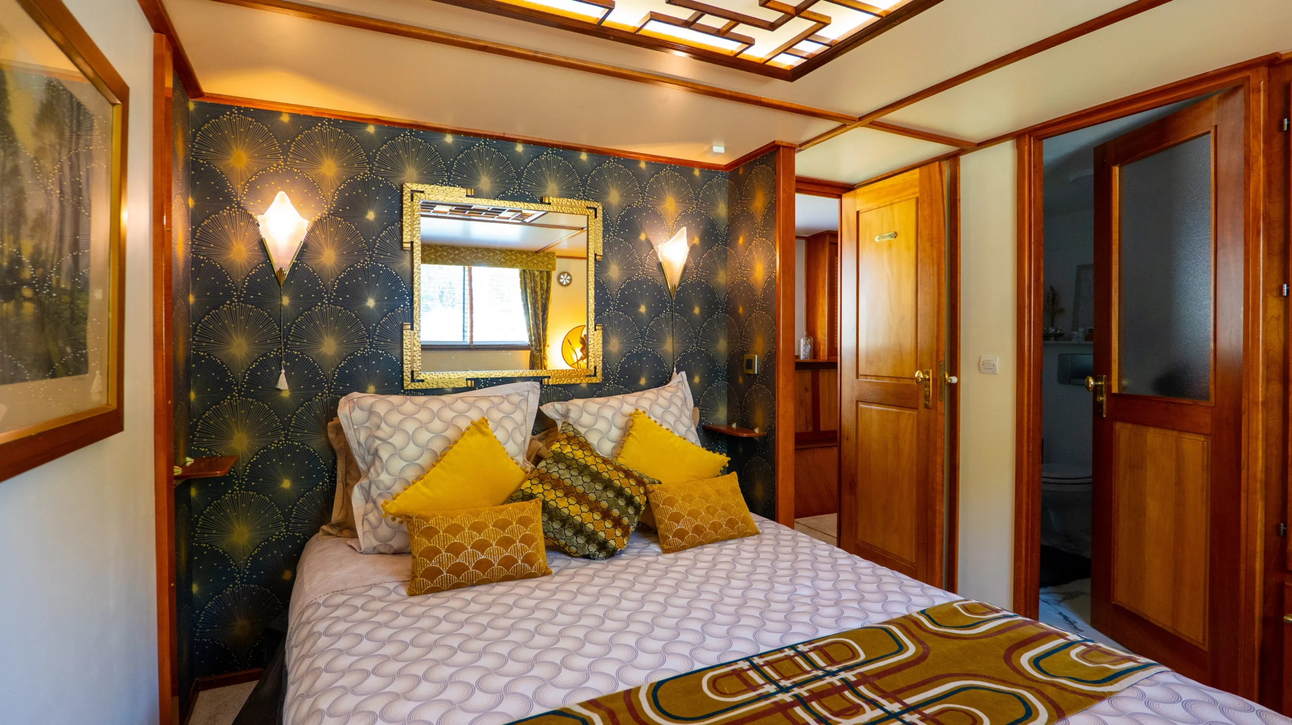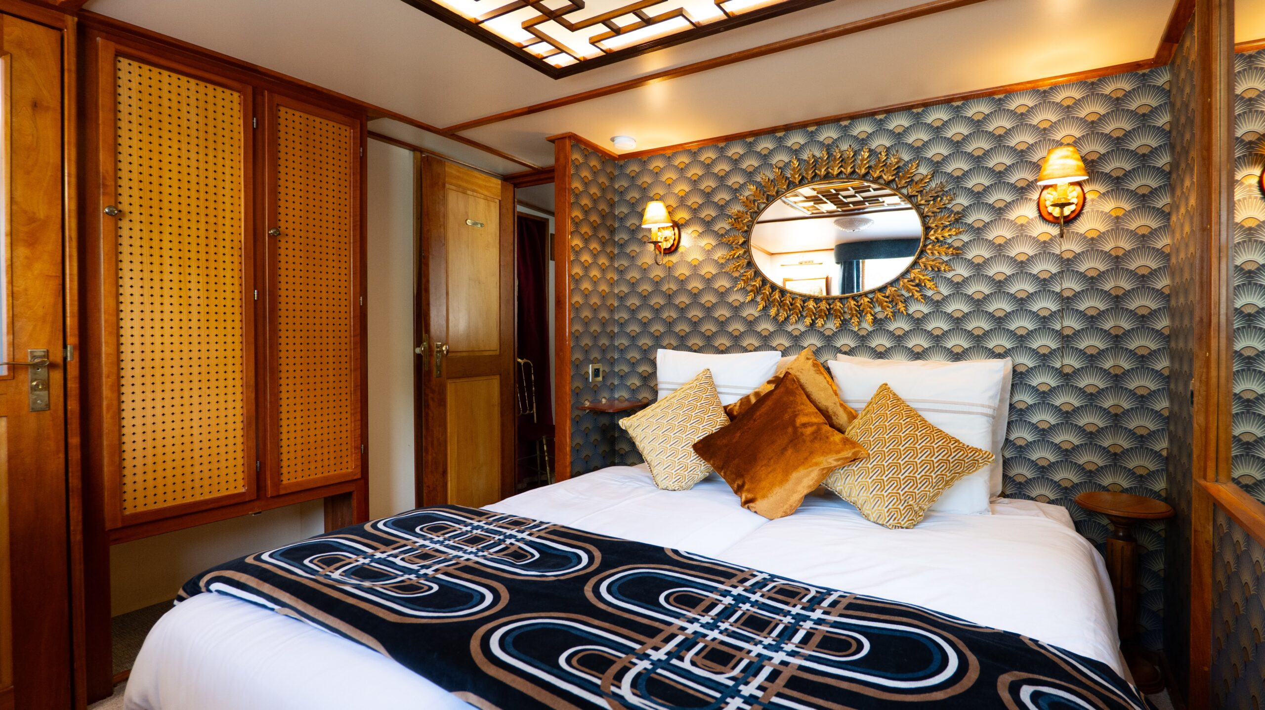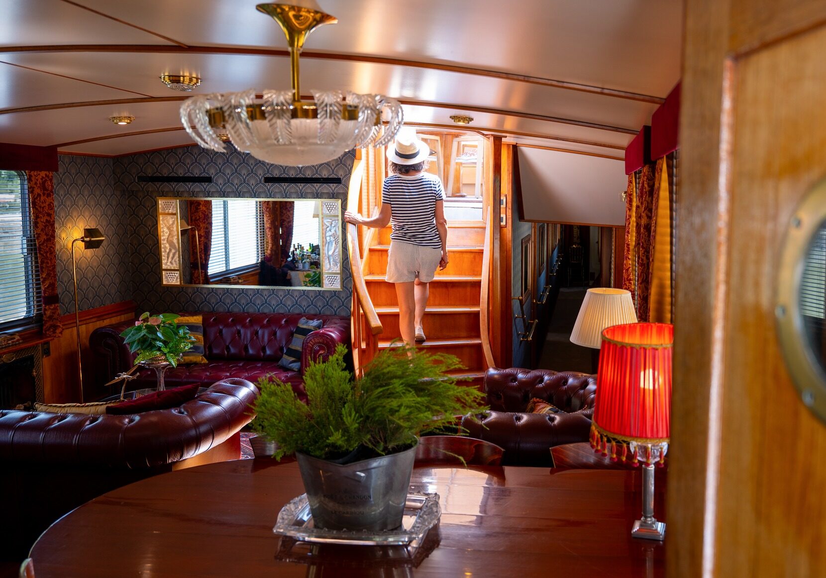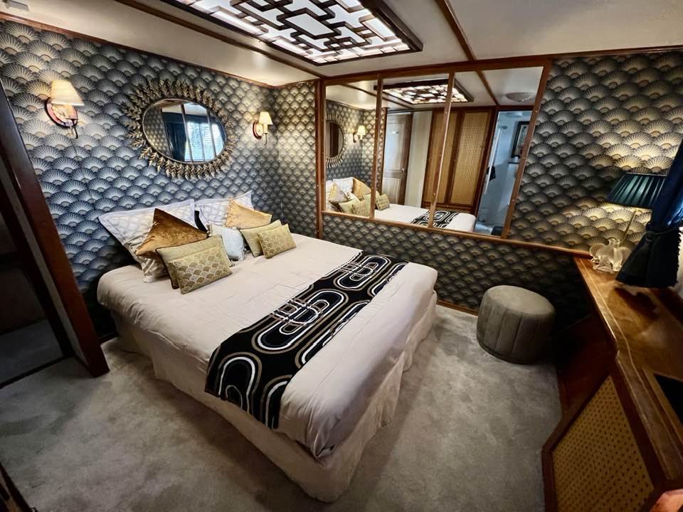 After the success of his first barge, the 6-guest Esperance, Captain Mathias Gilles unveils a new vision with Elegance: an homage to the Orient Express and Europe’s glamorous train travel of the 1920s. Onboard the Elegance, guests are transported into a Gatsby-esque reverie of polished marquetry, gleaming crystal, and a dollop of Jazz-Age decor. With three chic cabins offering Continental comforts, Elegance flows seamlessly from a stately salon to a graceful spiral staircase to a spacious deck, all designed for convivial gatherings all in true French style.