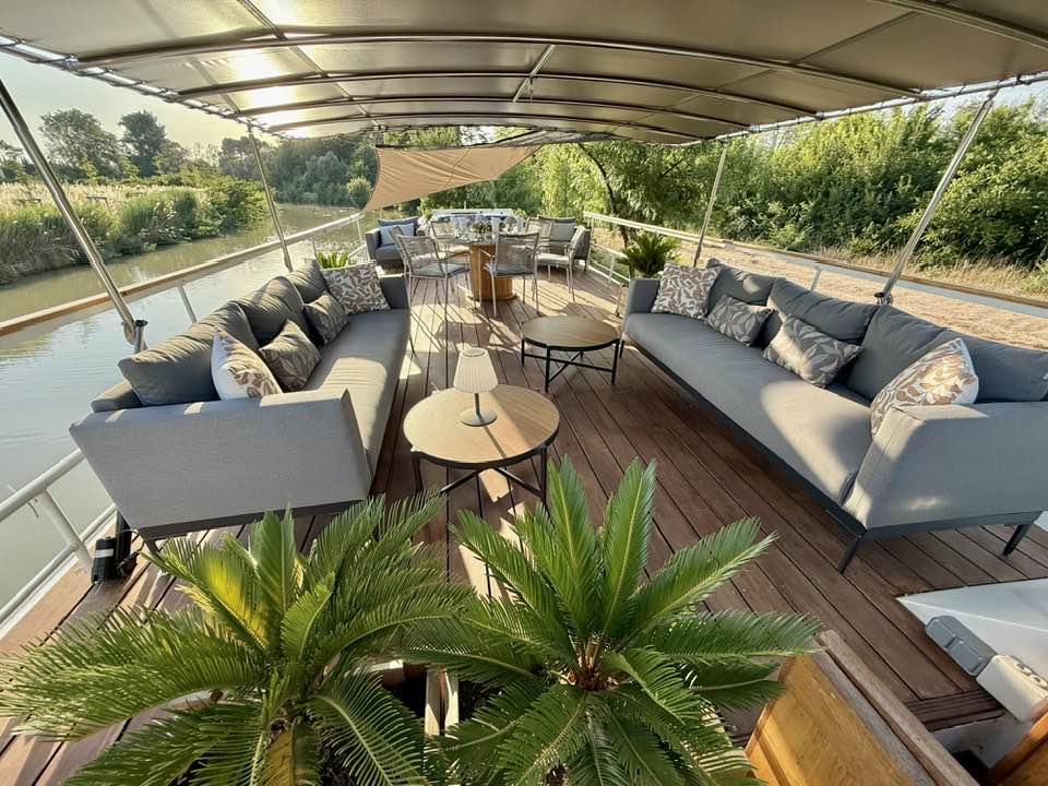 Onboard cuisine revels in Gascony’s legendary abundance, a region where dining and drinking rise to an art form. Imagine foie gras sourced from local farms and prunes luxuriantly simmered in Armagnac until they melt into pure indulgence. Platters of sumptuous farmhouse cheeses are paired with generous pours of the area’s wines and selections from nearby Bordeaux.