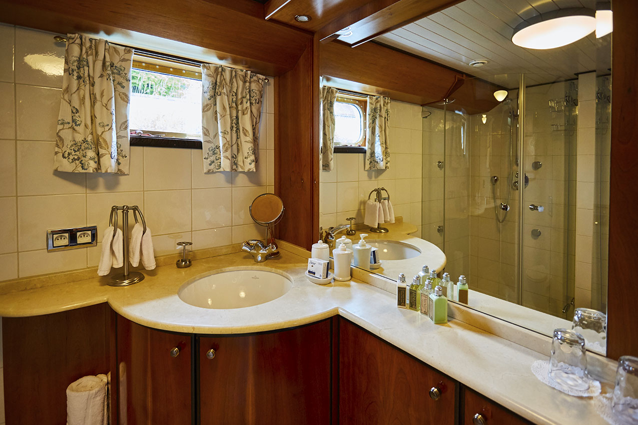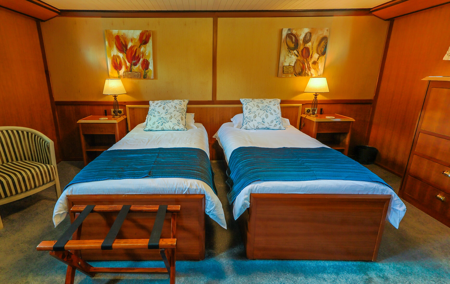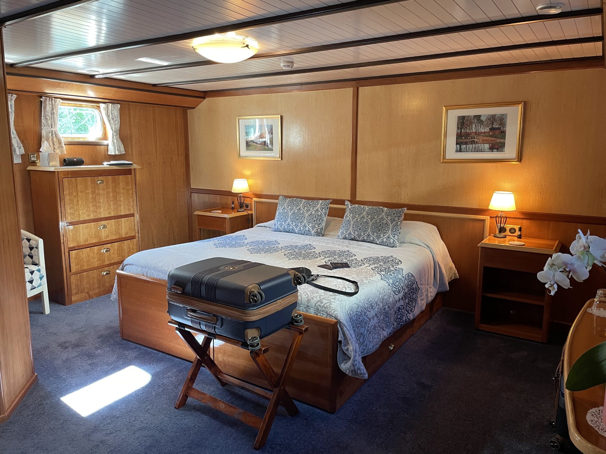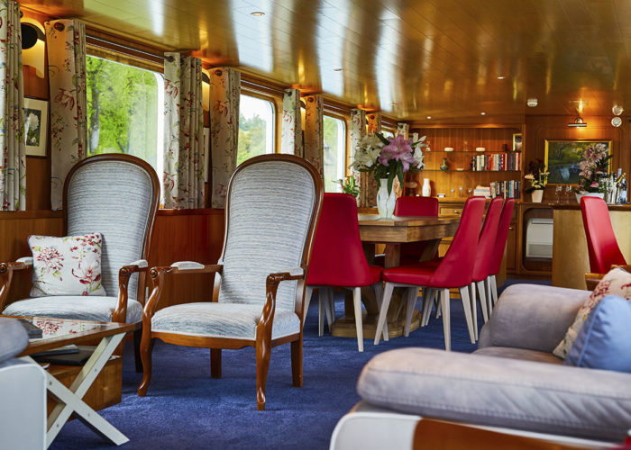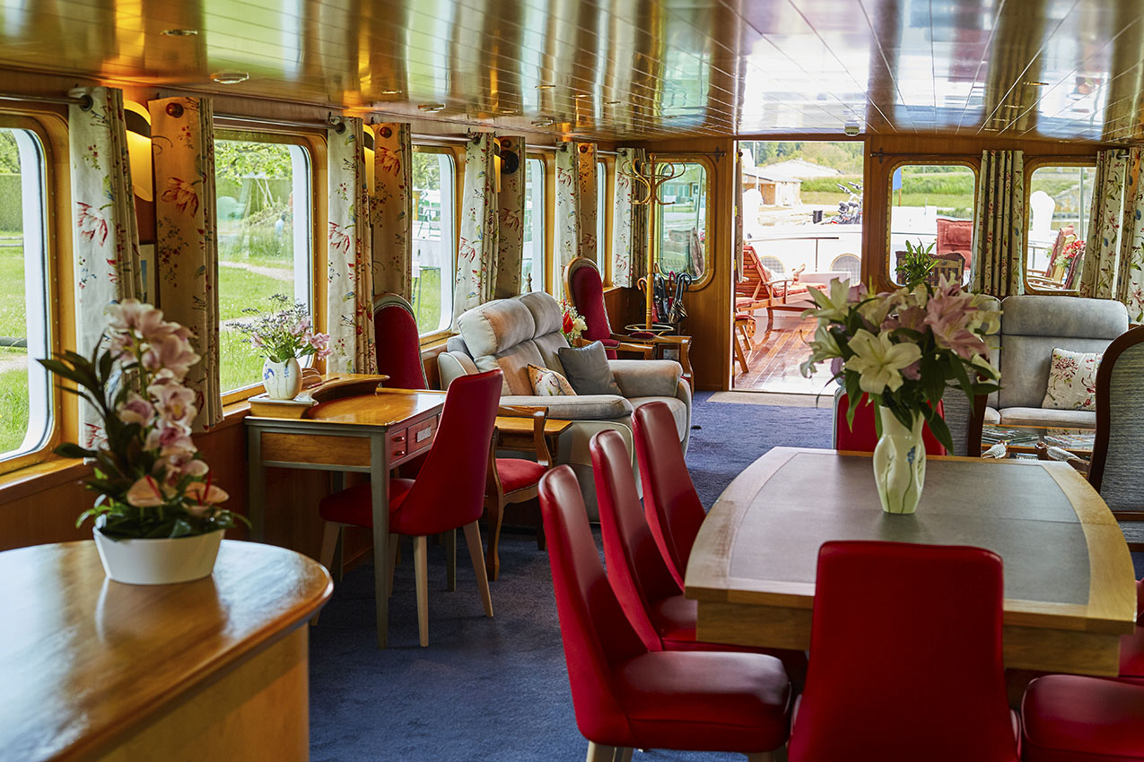This handsome barge welcomes guests to four of the most spacious and luxuriously appointed cabins on the canals, an enviable amenity for those to whom personal space is paramount. A newly refurbished salon sets the scene for hours of convivial socializing with friends both old and new.