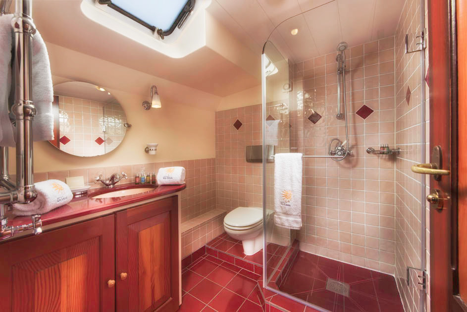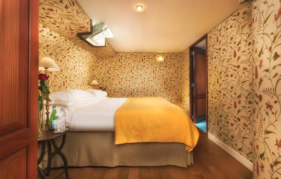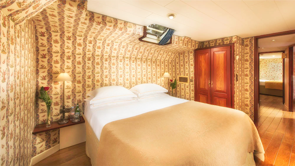 Stately design and patrician décor in the public areas epitomizes elegance with rich leather seating and plush textiles, subtly accented by pristine mahogany and brass trim. Three cabins abound with many deluxe details, such as designer French fabrics and elegant handmade tiled bathrooms. Numerous windows and skylights in the spacious salon offer incredible panoramic views of the canal, encouraging guests to linger while enjoying a glass of wine or cup of tea.