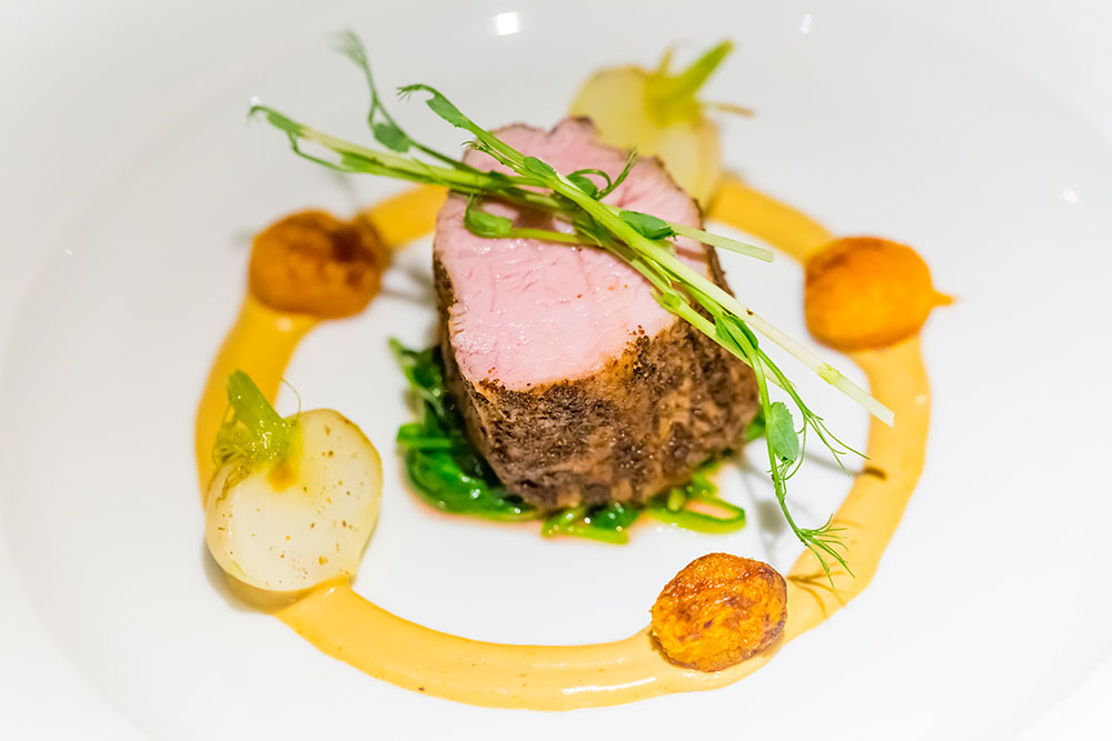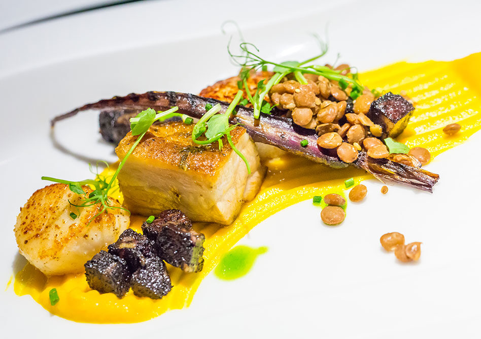 • Crispy Pork Belly with Chorizo and Apple Puree