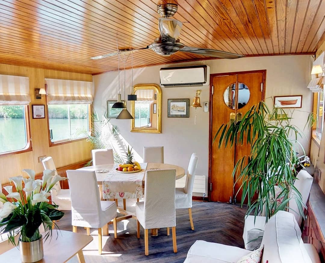 Serving as the barge’s social center and dining area, the pretty salon offers plenty of inviting seating, perfect for relaxing over a glass of locally-produced Sauternes or a nip of small batch Armagnac. The spacious sundeck beckons for festive al fresco meals, while comfortable lounge chairs ensure the perfect perches to watch the scenery slip by. Four cozy ensuite staterooms accommodate up to eight passengers.