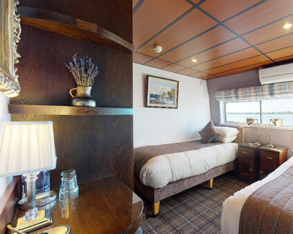 Stepping onboard the Shannon Princess, guests can expect a warm welcome to the Emerald Isle. Offering the perfect perches to connect with friends both old and new, the social centers of the barge include the lovely light-filled salon, the formal dining area, and the spacious deck. Five cozy cabins ensure peaceful and evening and plenty of privacy with clever storage space and beautifully tiled bathrooms.